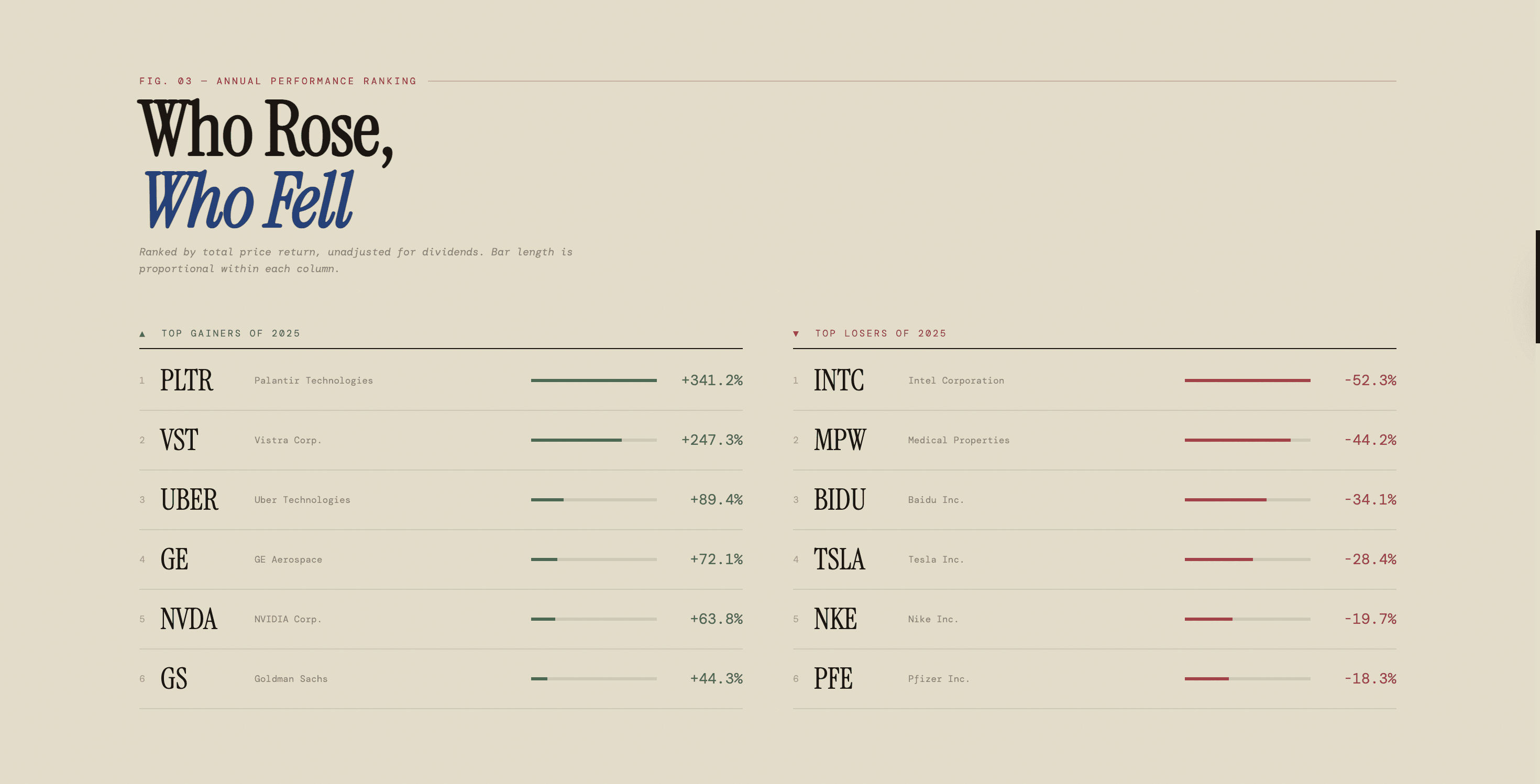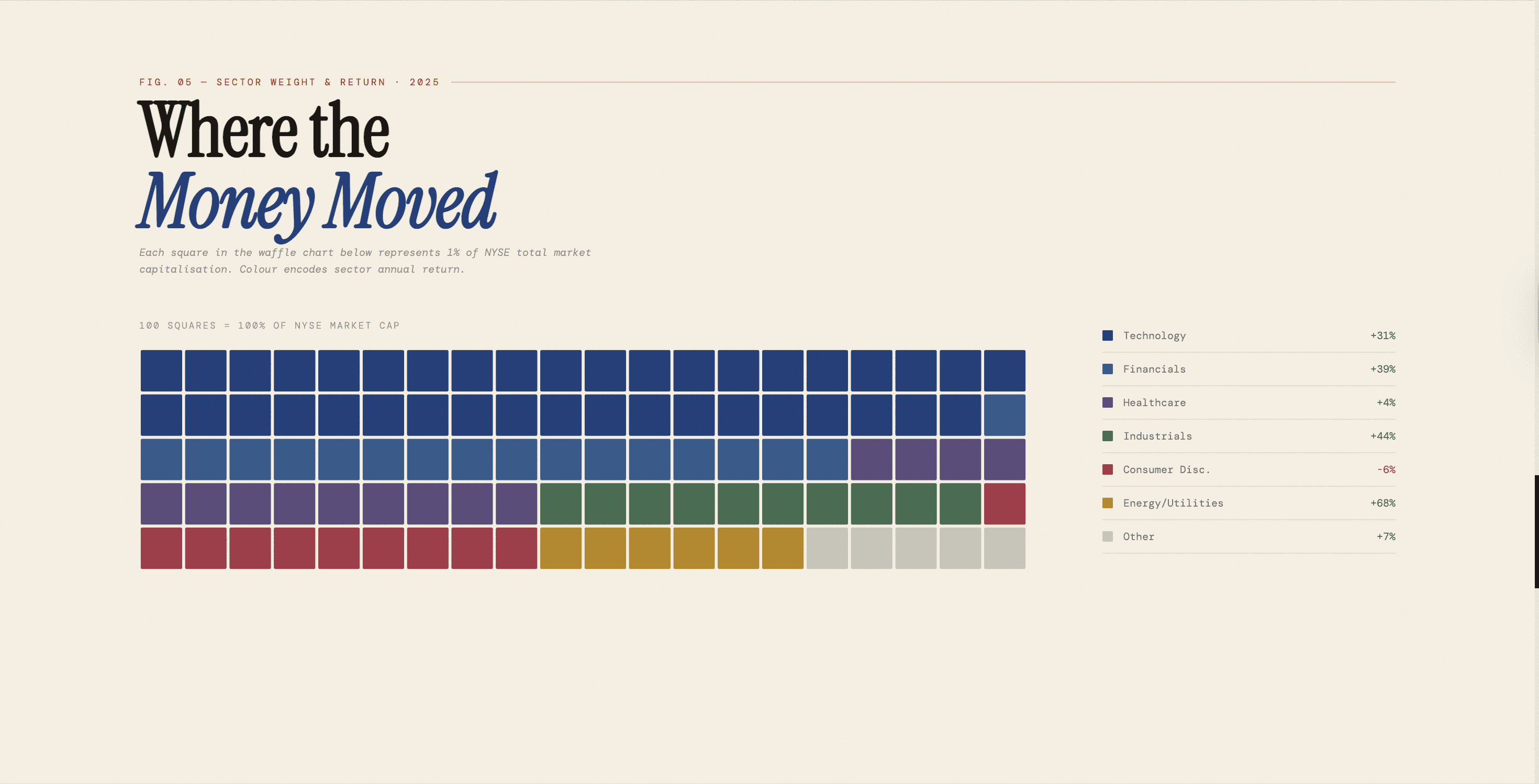 Annual market data is almost always presented in the same way, Bloomberg terminals, candlestick charts, and red and green tables. The challenge was to take a year of NYSE trading data and turn it into something people actually want to read: a publication, not a dashboard.