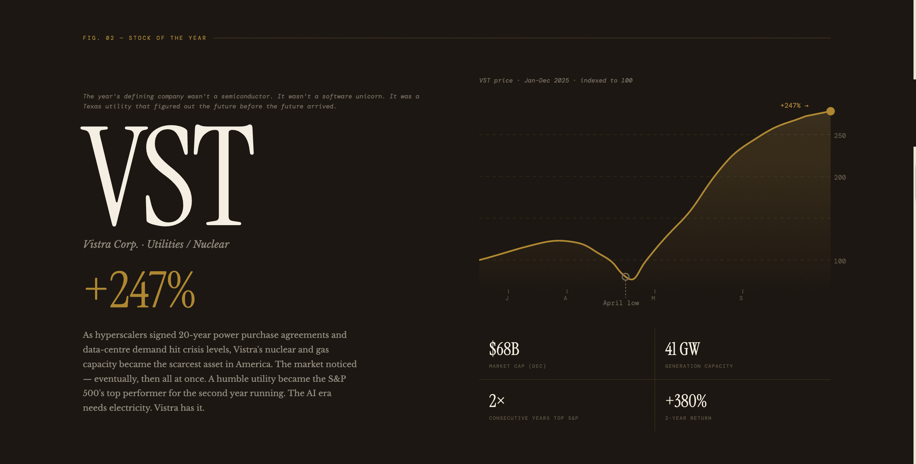 A self-contained, scroll-driven editorial experience that treats market data as a human story rather than a performance readout. Each section functions both as a standalone data poster and as a chapter in a year-long narrative — from the January optimism through the April collapse, the summer stall, and the year-end resolution.