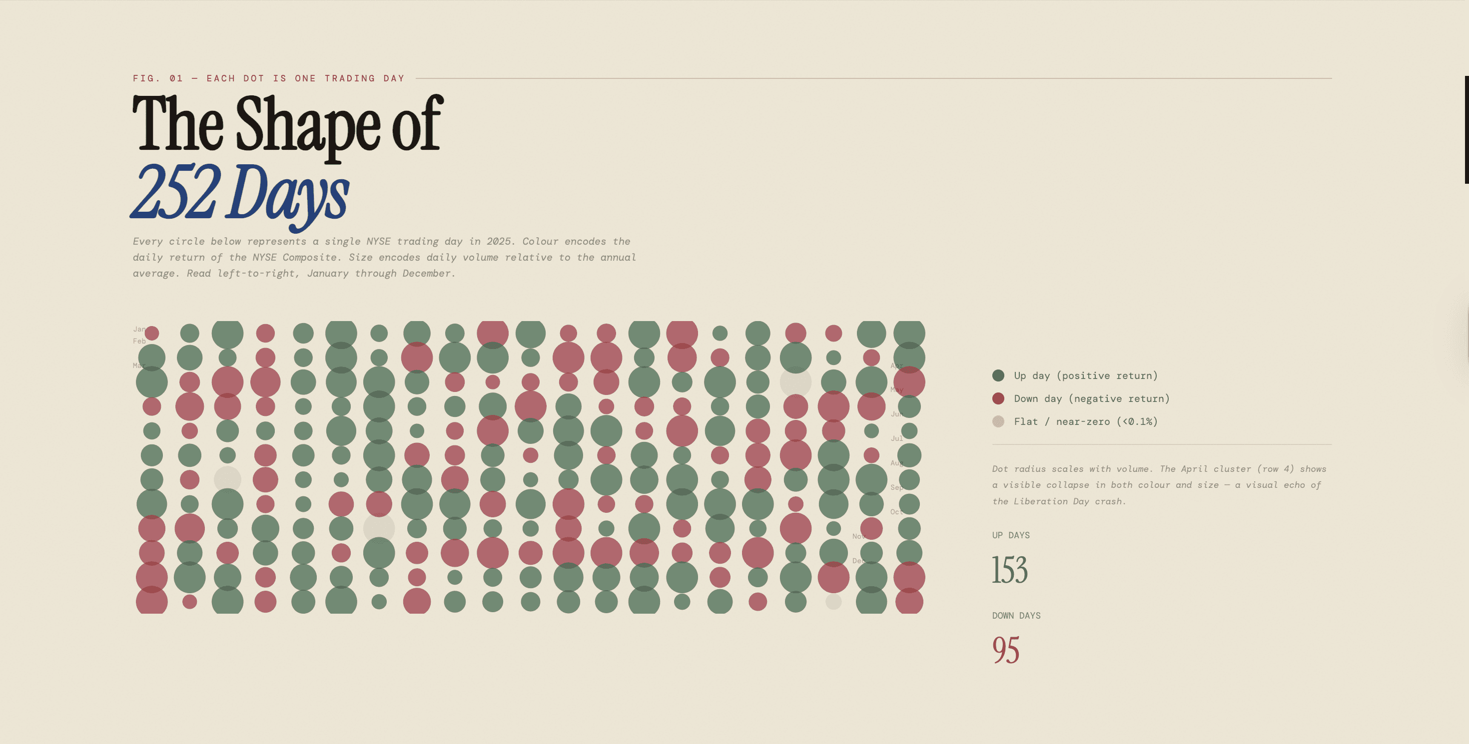 Dot matrix over line chart. 252 circles, one per trading day, where colour encodes direction and radius encodes volume. The April crash reads as a dense red cluster without a single label.