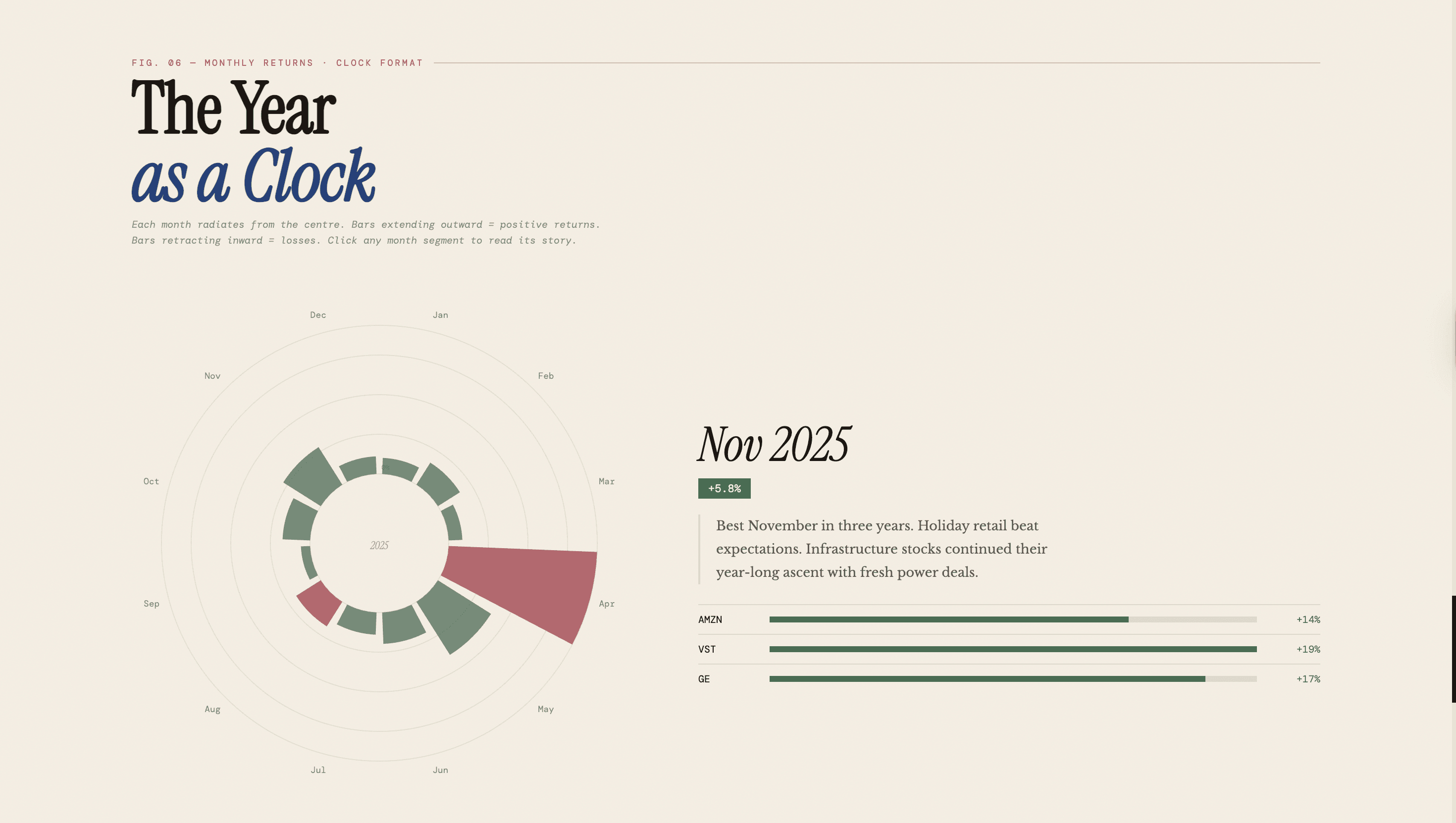 Radial clock for monthly performance. Twelve arcs radiating from centre, length proportional to return. The rhythm of the year, violent April contraction, May surge, readable in one glance. Click any arc to read the month's story.