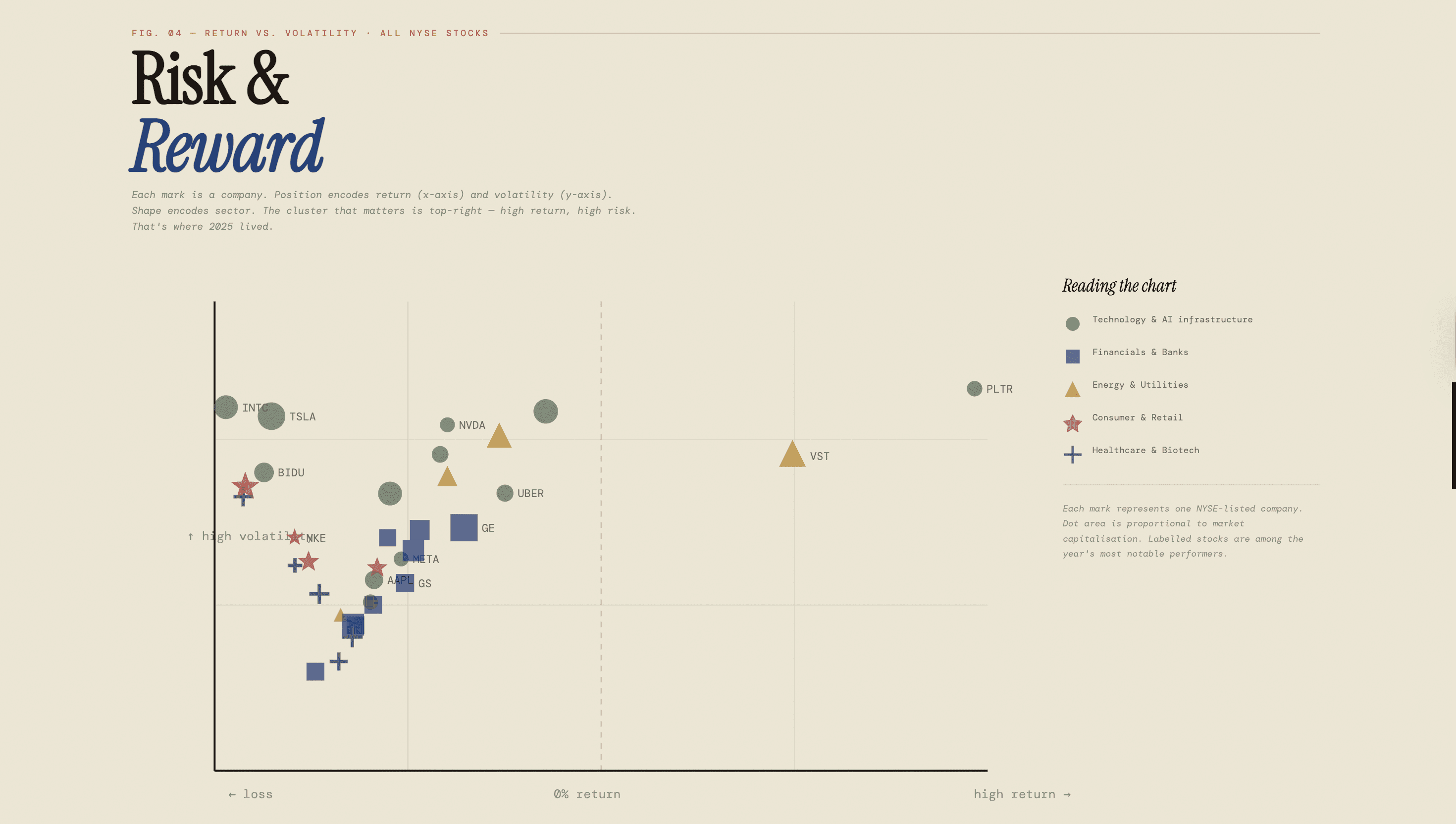 Shape-encoded scatter. Return vs. volatility for the full NYSE universe. Each sector gets a distinct geometric mark, circle, square, triangle, star, cross, inspired by Lupi's Dear Data: the shape is the legend.